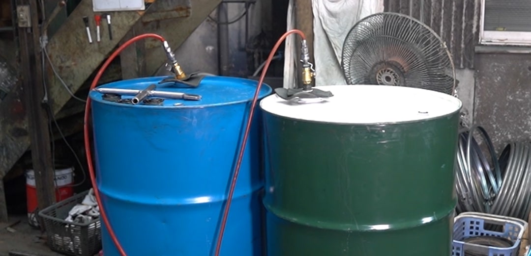 ドラム缶の天地板を抑えてから、圧縮空気を注入して胴体の凹凸を修正します。